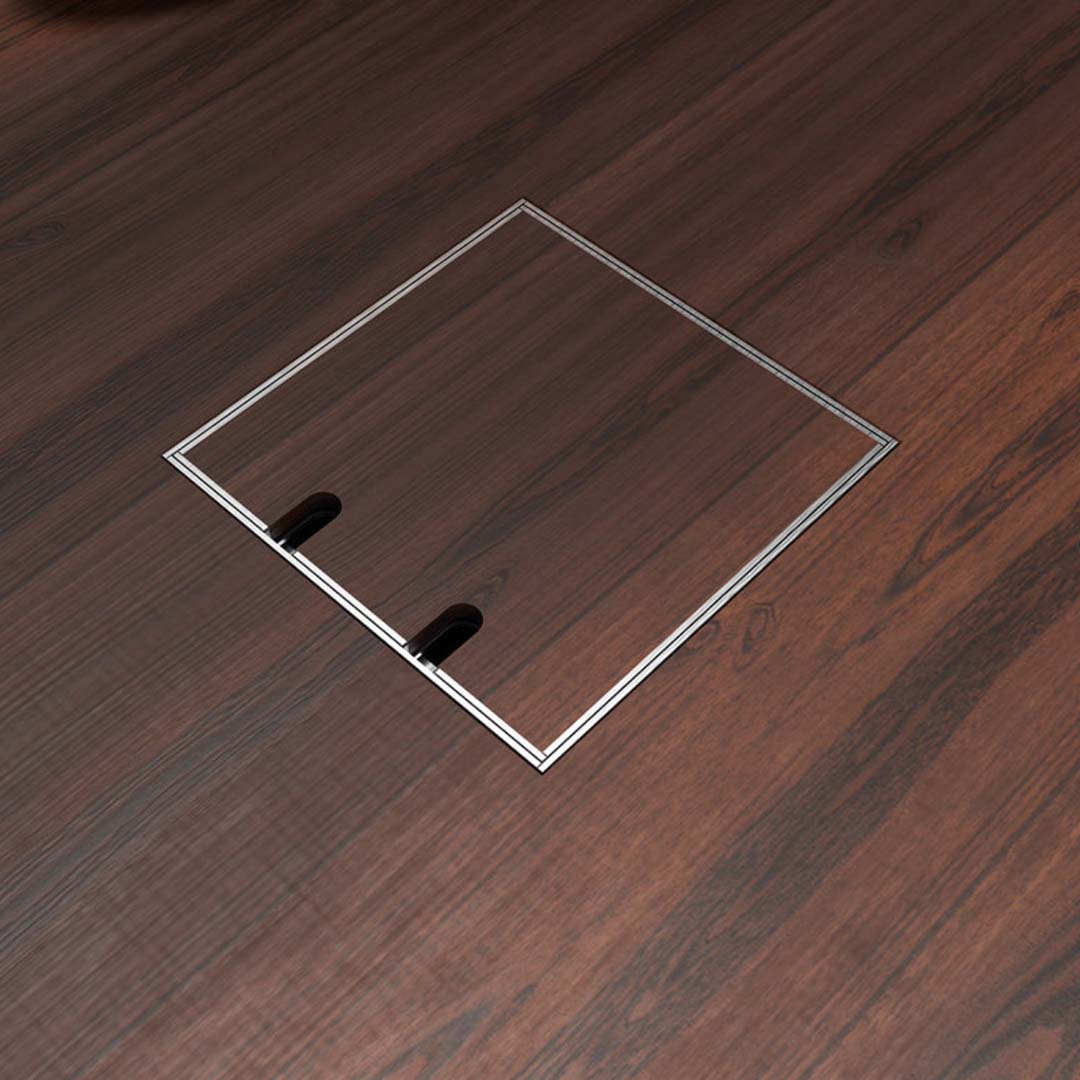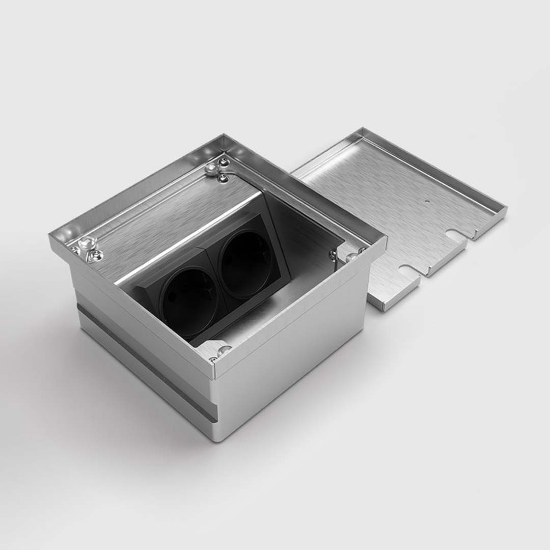 Bodensteckdose aus Aluminium mit Deckel zum auflegen. Deckel und Rahmen sind aus Edelstahl. Der Deckel kann mit eigenem Belag ausgelegt werden. Die Belagstärke inkl. Kleber darf max. 6 mm betragen. Der Deckel schließt auch bei gesteckten Standardsteckern in gerader oder abgewinkelter Form.