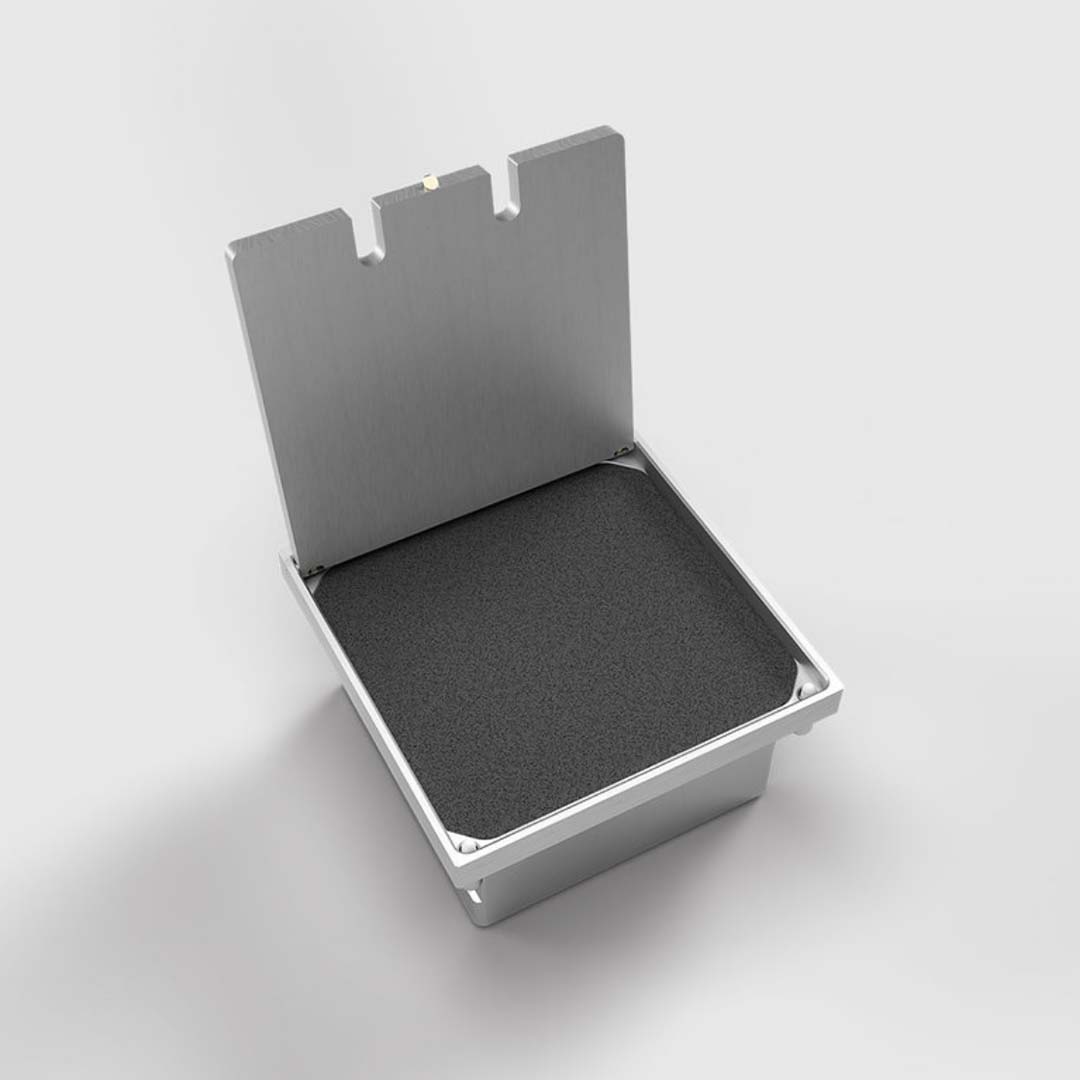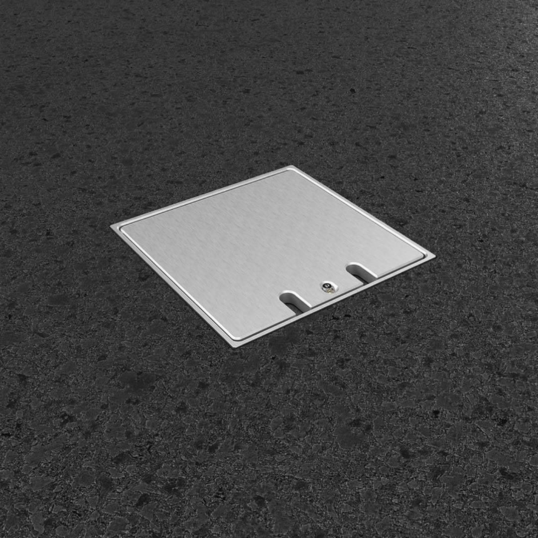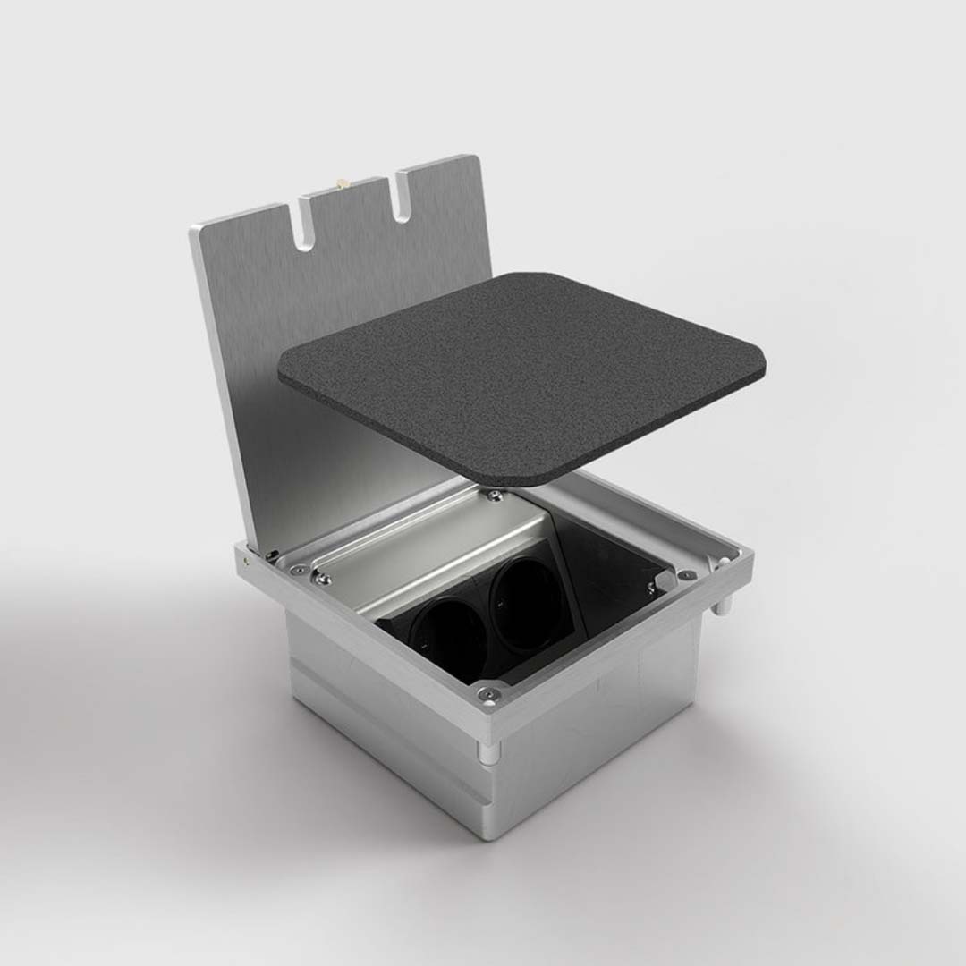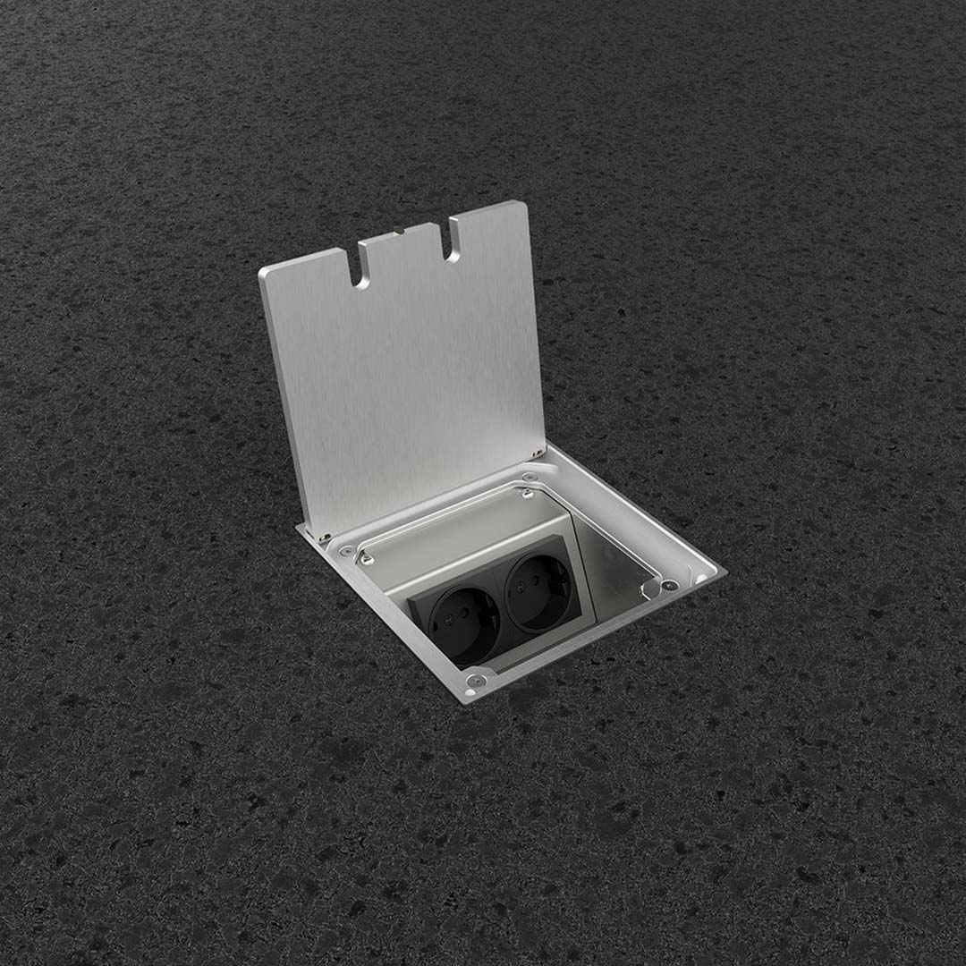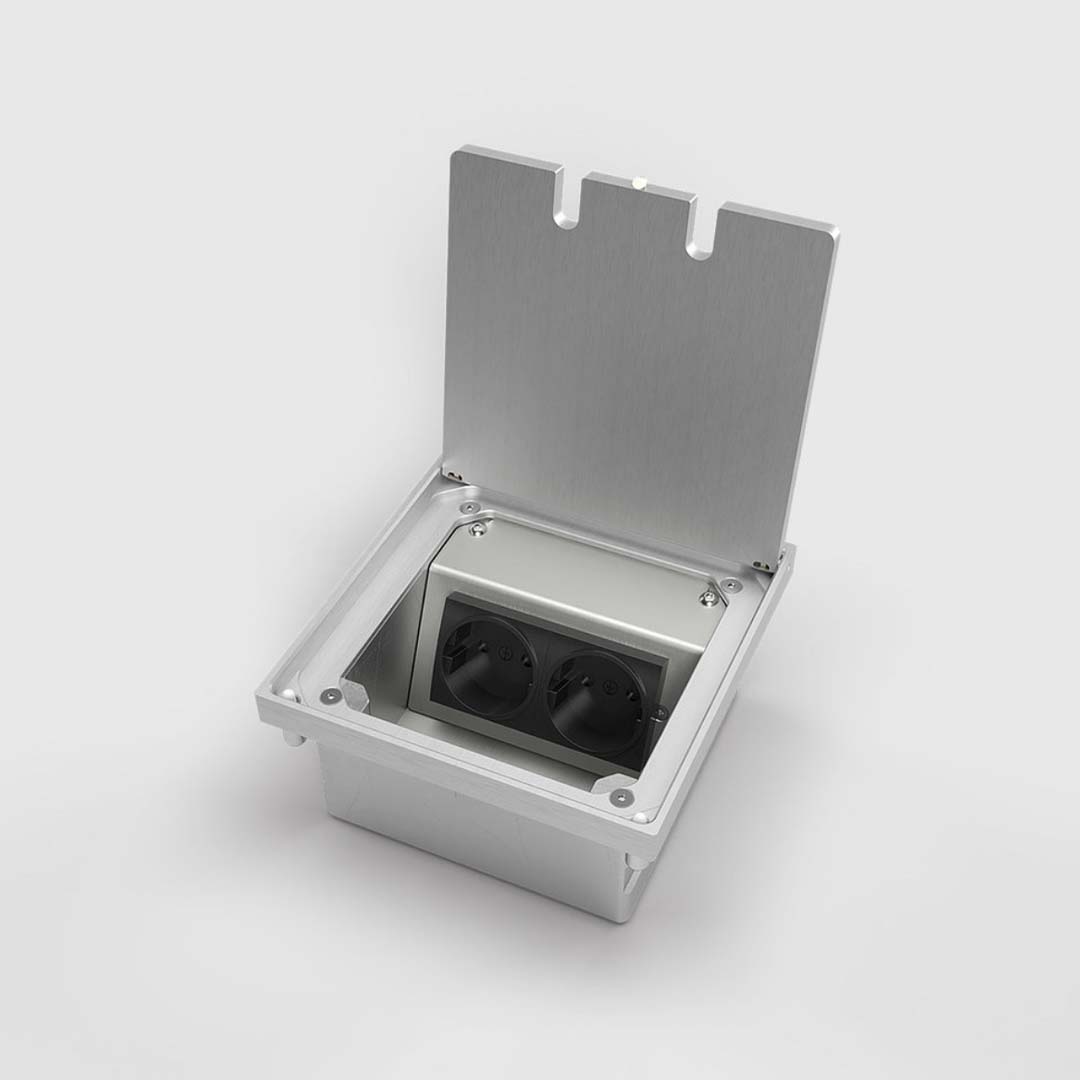 Bodensteckdose aus massivem Aluminium mit verschließbarem Klappdeckel. Einfaches Öffnen und Schließen des Deckels durch einen im Deckel integrierten Schnappverschluss. Geschlossen ist die Bodensteckdose durch die Deckeldichtung spritzwassergeschützt und somit für auch für Nasskehrgeräte geeignet. Deckel schließt auch bei gestecktem Standardstecker in gerader oder abgewinkelter Form.