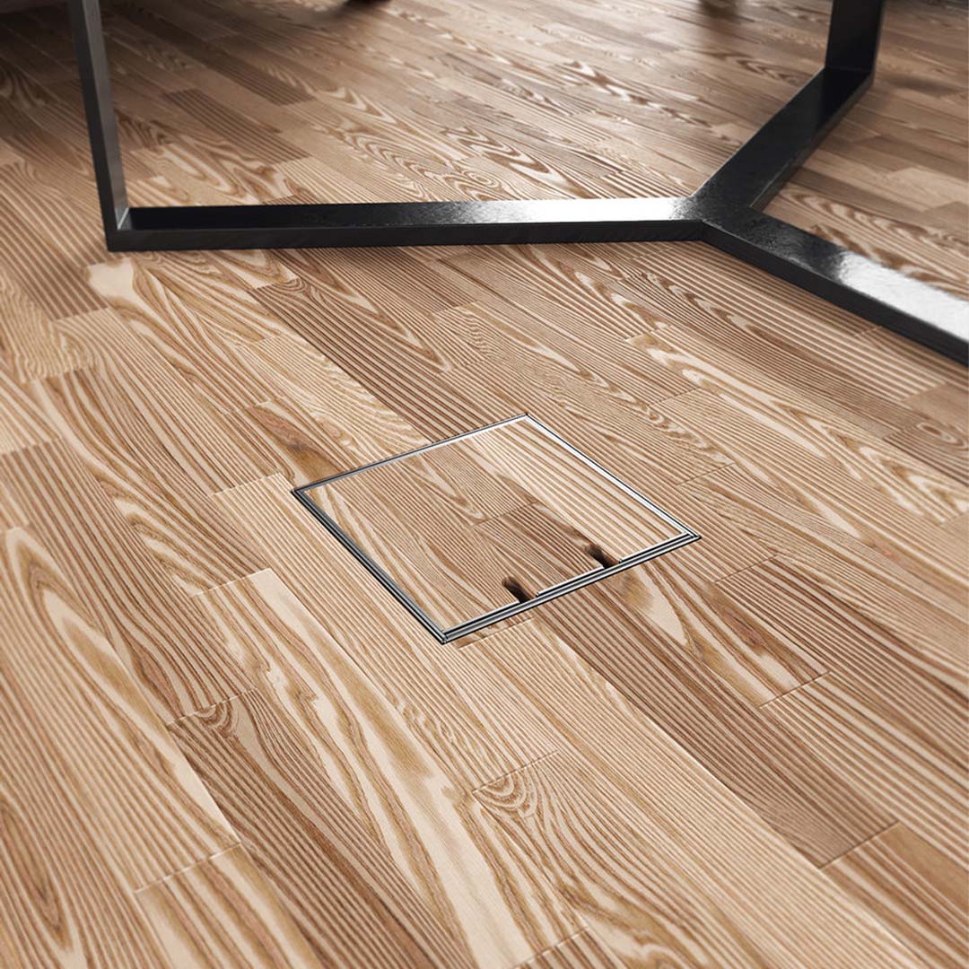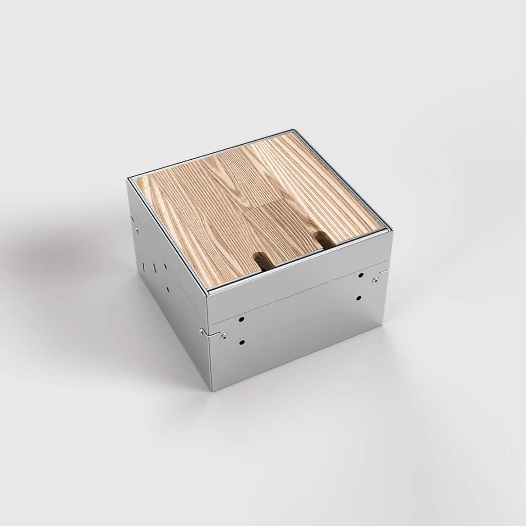 Das Gehäuse besteht aus 1,5 mm geschliffenem Edelstahl 1.4301 und verfügt über einen Klappdeckel, der mit eigenem Bodenbelag ausgelegt werden kann. Die Belagstärke inkl. Kleber beträgt 15 mm. Die Aufnahmebox besteht aus Sendzimier verzinktem Stahlblech. Diese Ausführung ist für Einzellasten bis 120 kg ausgelegt, d.h. nach DIN VDE 0634 Teil 1 begehbar. Vorausgesetzt wird der sachgemäße Einbau.  Nivellierschrauben ermöglichen eine Höhenkorrektur bis ca. 30 mm.