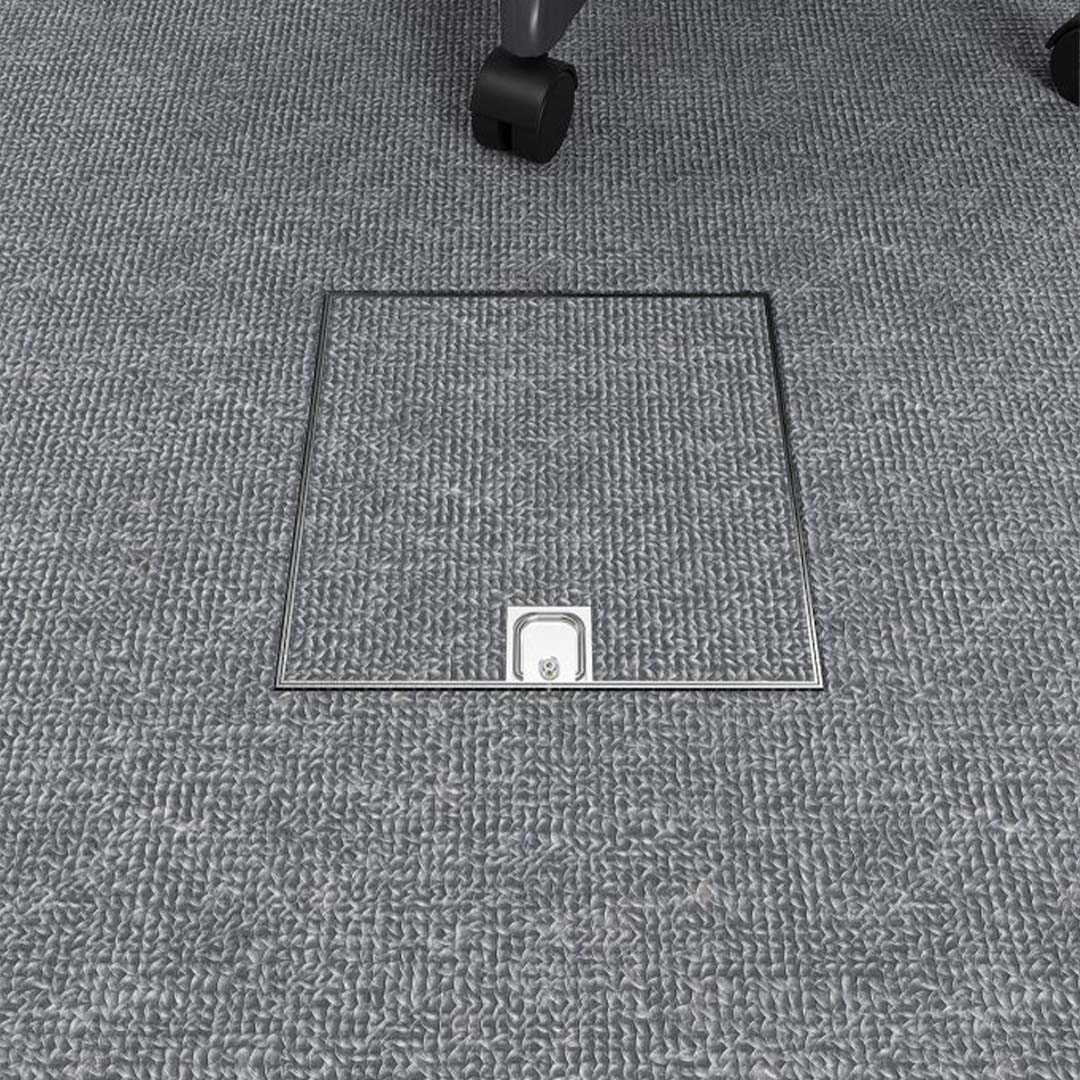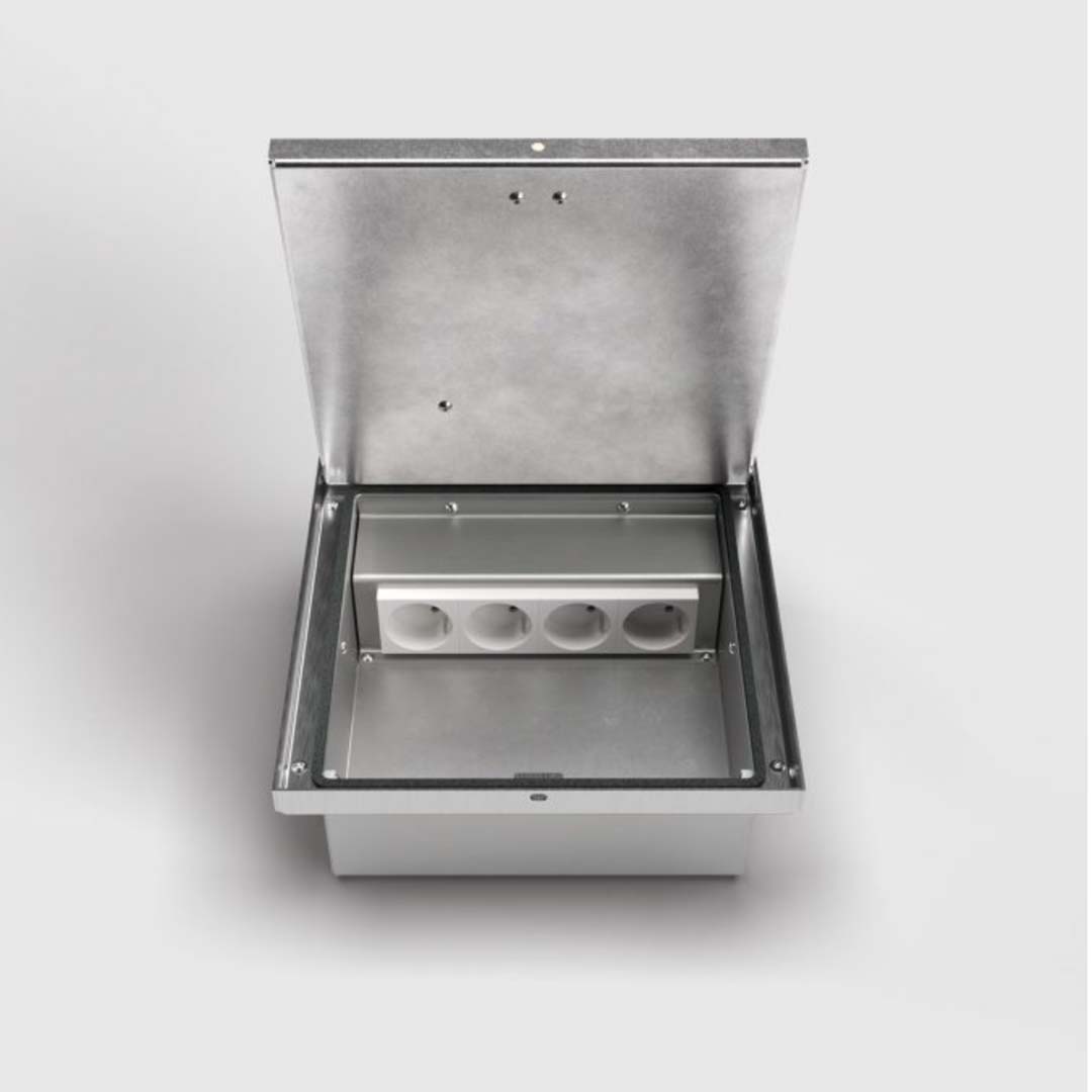 Der komplette Bodentank wird aus 1,5 mm starkem V2A Edelstahl gefertigt. Der werkzeuglos zu öffnende Klappdeckel ist so konzipiert, dass der eigene Bodenbelag integriert werden kann. Die Belagstärke darf nicht mehr als 15 mm betragen (inkl. Kleber). Geschlossen ist der Bodentank wasserdicht und somit zur Reinigung mit Nasskehrgeräten geeignet. Die Geräteeinheit kann bis zu 4 Installationsgeräte beinhalten.