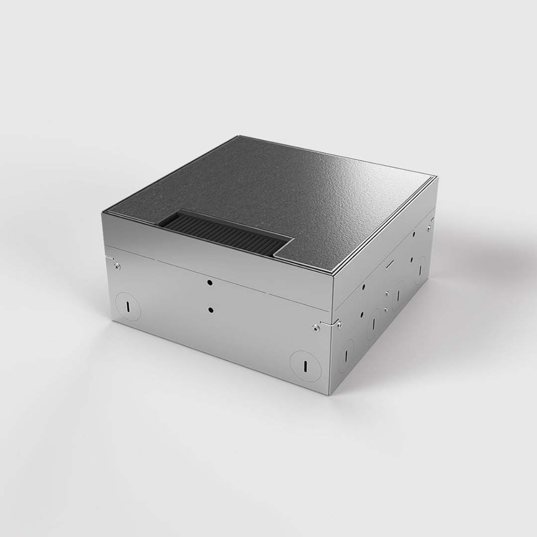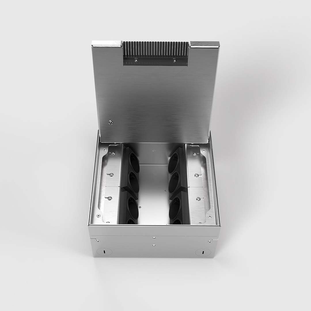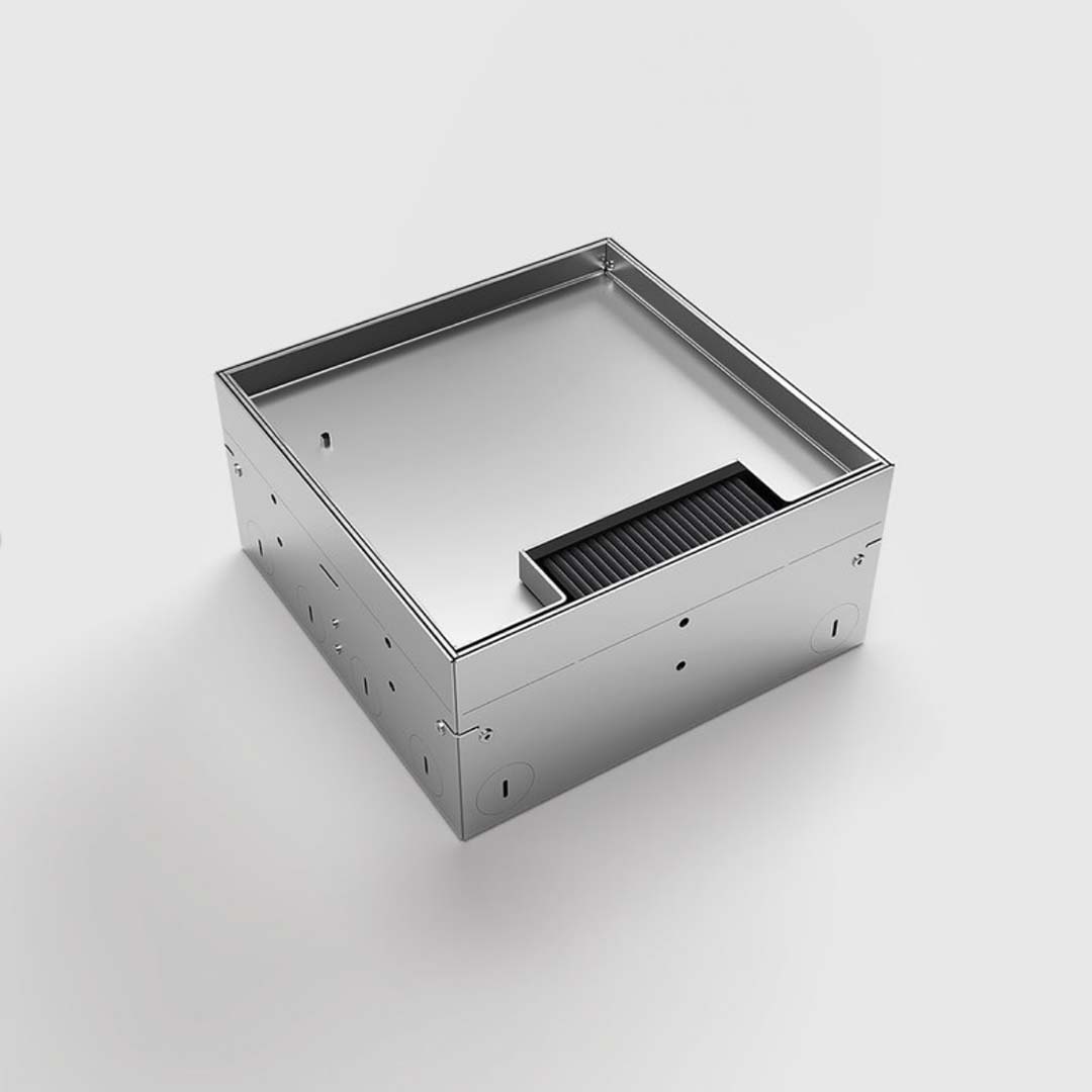 Das Gehäuse ist mit einem Klappdeckel ausgestattet und besteht aus 1,5 mm geschliffenem Edelstahl 1.4301. Der Deckel kann mit eigenem Belag ausgelegt werden. Die Belagstärke inkl. Kleber beträgt 15 mm. Die Aufnahmebox besteht aus Sendzimier verzinktem Stahlblech. Diese Ausführung ist für Einzellasten bis 120 kg ausgelegt, d.h. nach DIN VDE 0634 Teil 1 begehbar. Vorausgesetzt wird der sachgemäße Einbau. Nivellierschrauben ermöglichen eine Höhenkorrektur bis ca. 30 mm.