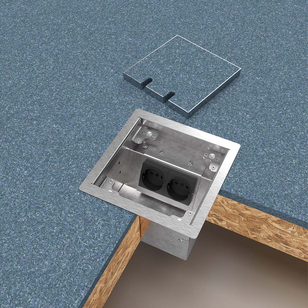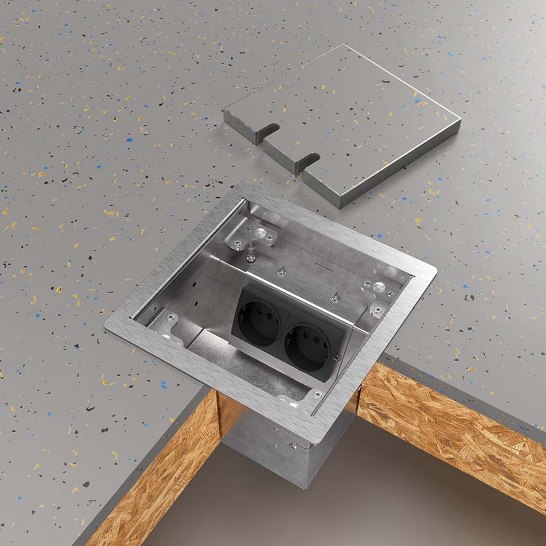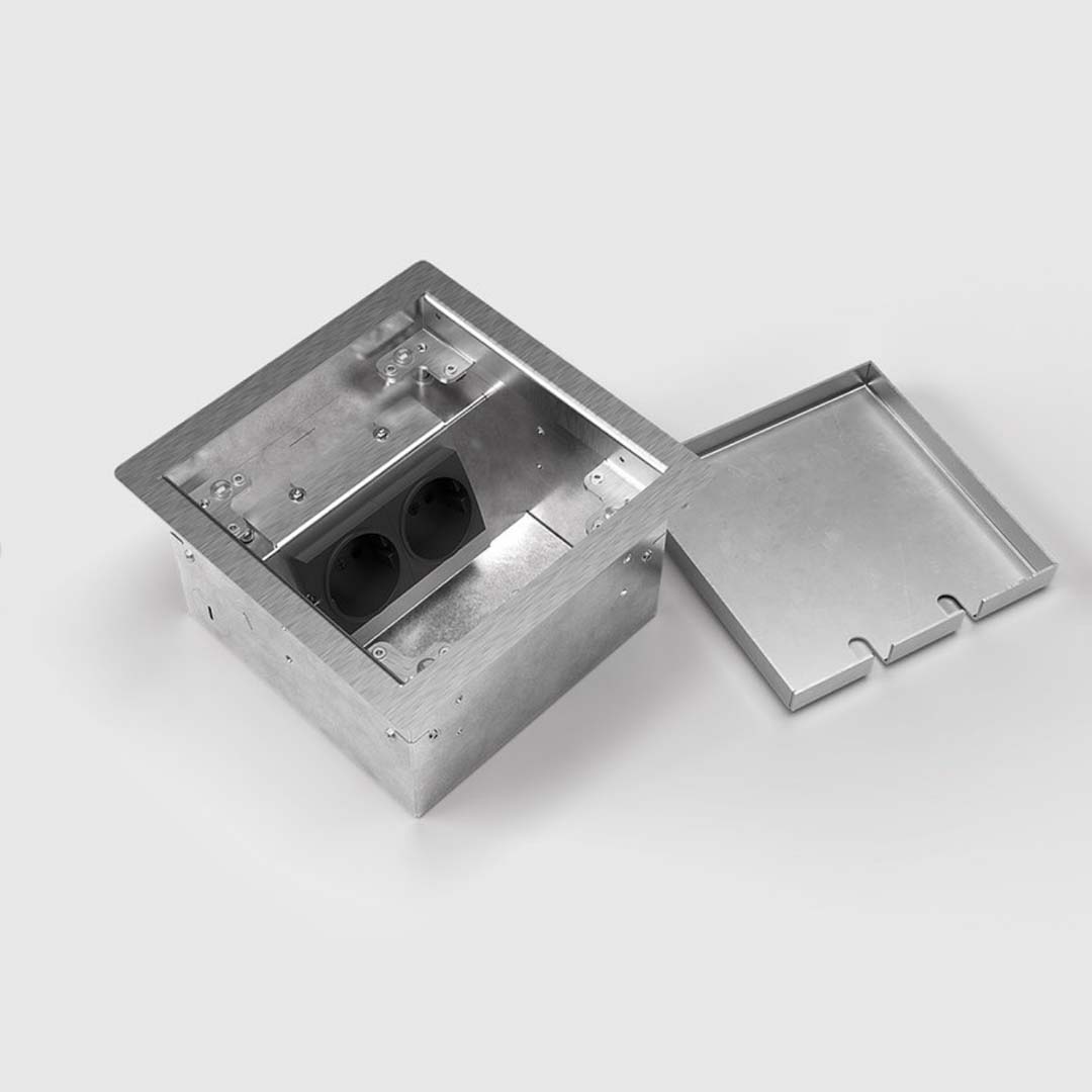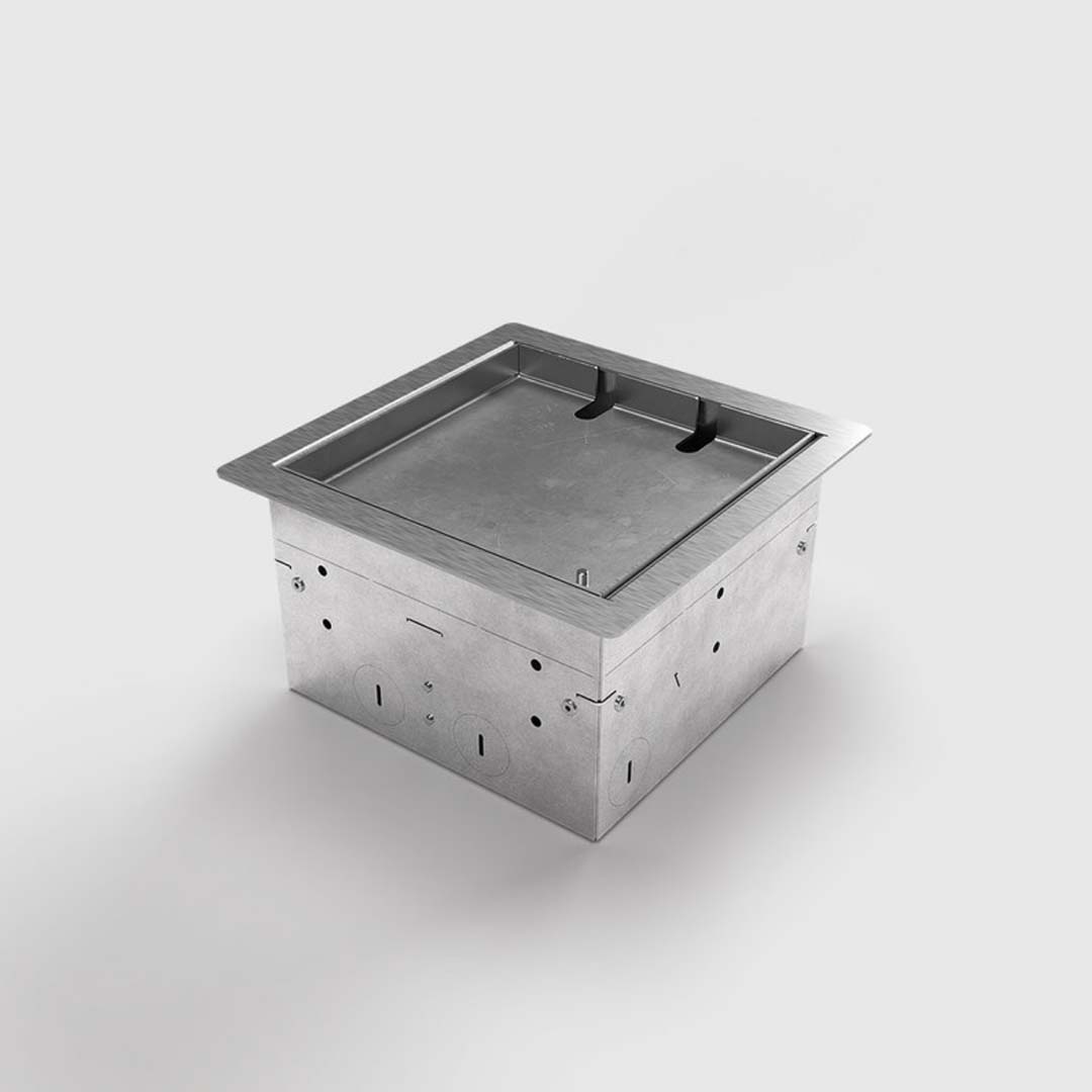 Das Gehäuse besteht aus 1,5 mm geschliffenem Edelstahl 1.4301. Der Deckel ist zum auflegen und kann mit eigenem Belag ausgelegt werden. Die Belagstärke inkl. Kleber beträgt 15mm. Die Aufnahmebox besteht aus Sendzimier verzinktem Stahlblech. Diese Ausführung ist für Einzellasten bis 120 kg ausgelegt, d.h. nach DIN VDE 0634 Teil 1 begehbar. Vorausgesetzt wird der sachgemäße Einbau.
