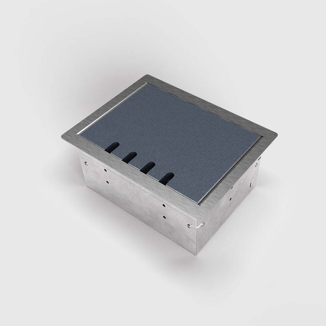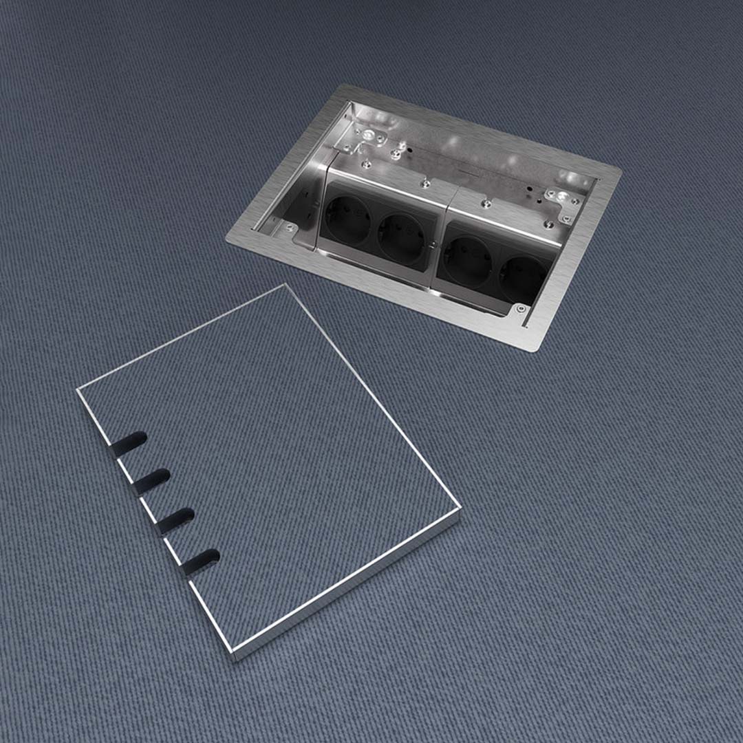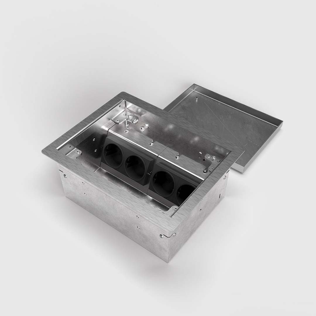 Das Gehäuse besteht aus Edelstahl 1.4301 V2A 1,5 mm stark, die Oberfläche ist geschliffen. Die Steckdose verfügt über einen Deckel, der aufgelegt und mit eigenem Belag ausgelegt wird. Die Belagstärke sollte, inkl. Kleber, nicht mehr als 15mm betragen. Diese Ausführung ist für Einzellasten bis 120 kg ausgelegt d.h. nach DIN VDE 0634 Teil 1 begehbar. Vorausgesetzt wird der sachgemäße Einbau. Die Aufnahmebox besteht aus Sendzimier verzinktem Stahlblech.