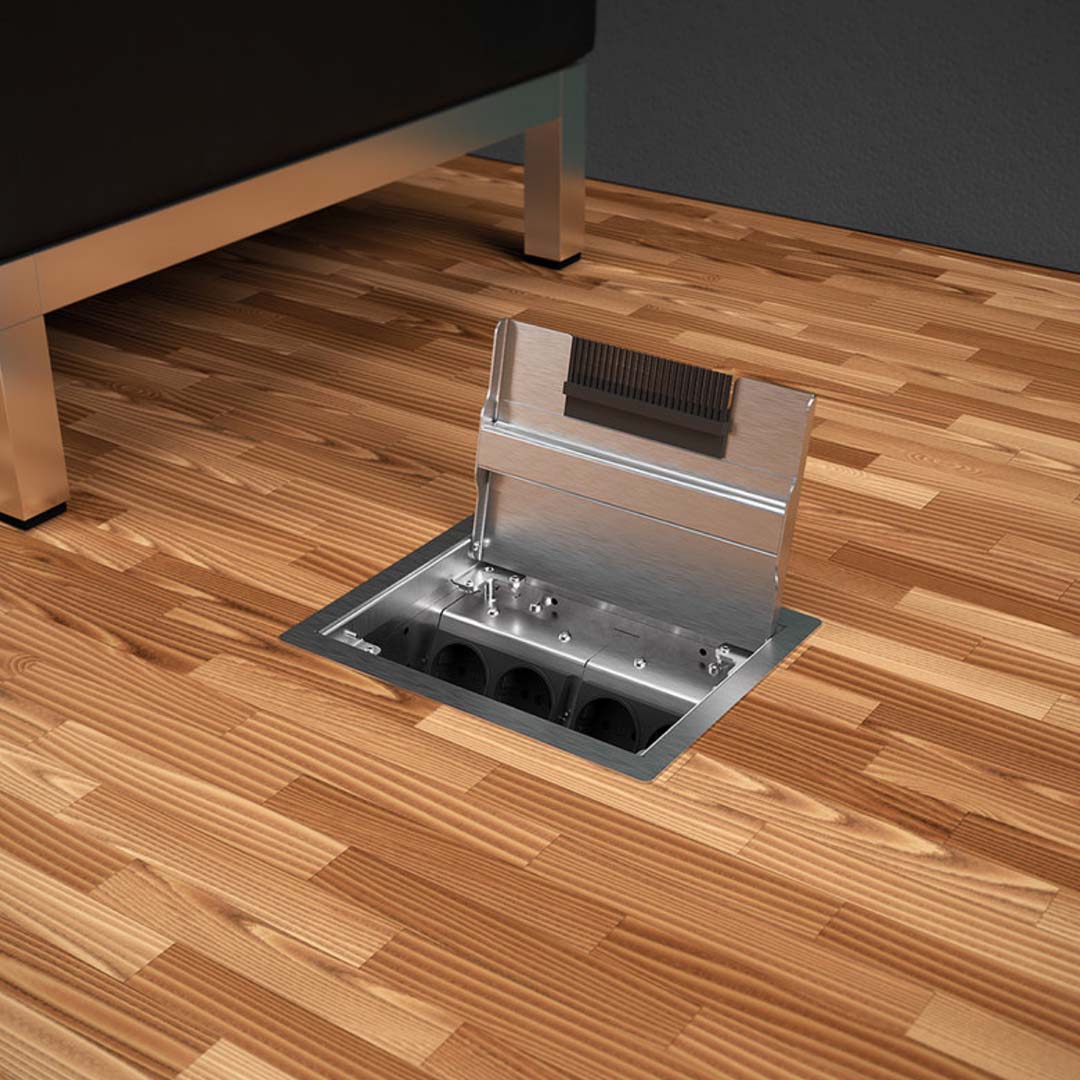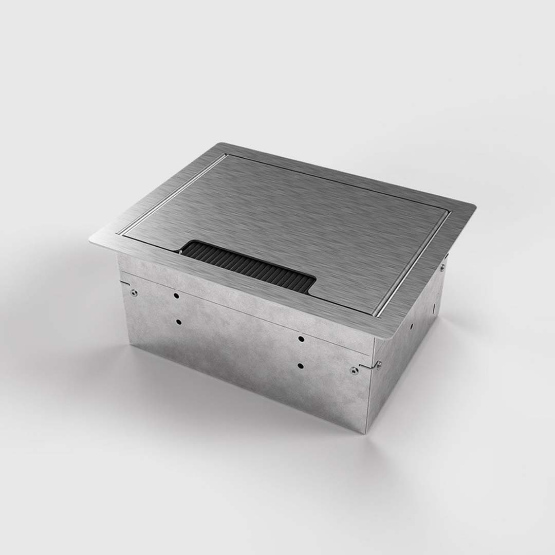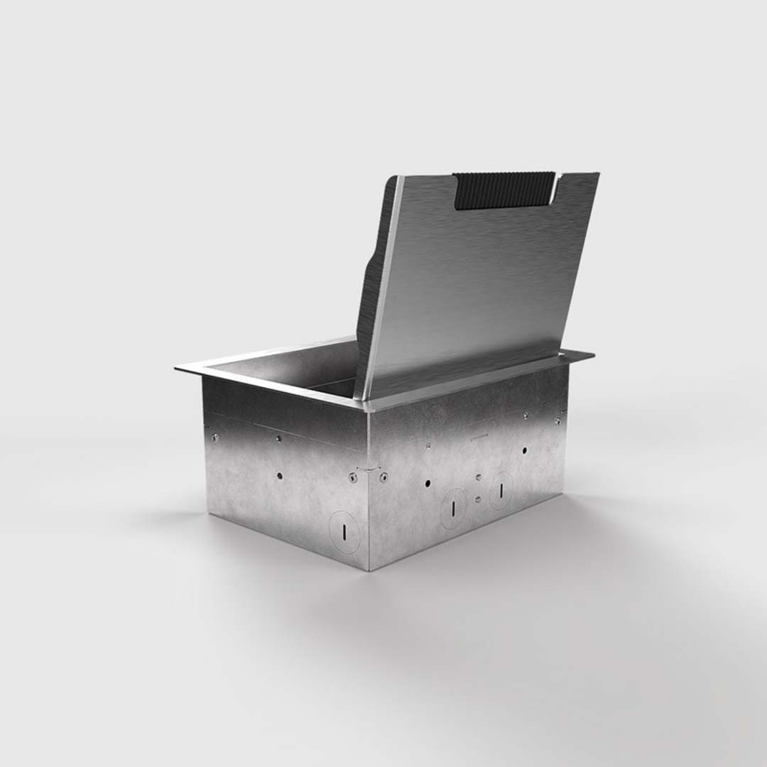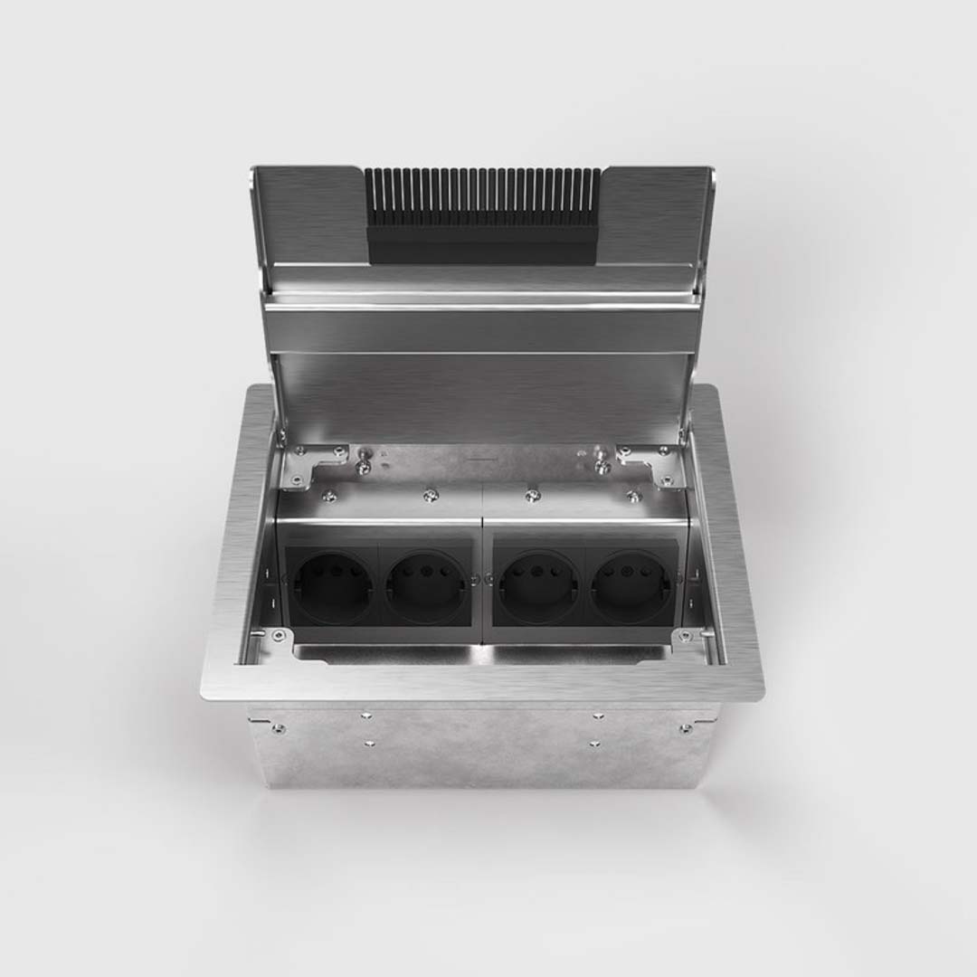 Das Gehäuse besteht aus Edelstahl 1.4301 V2A 1,5 mm stark, Oberfläche geschliffen. Die Steckdose wird über einen Klappdeckel geöffnet, der eine Aussparung zur Kabeldurchführung aufweist. Das ermöglicht das schließen des Deckels auch bei gesteckten Steckern. Diese Ausführung ist für Einzellasten bis 120 kg ausgelegt d.h. nach DIN VDE 0634 Teil 1 begehbar. Vorausgesetzt wird der sachgemäße Einbau. Die Aufnahmebox besteht aus Sendzimier verzinktem Stahlblech.