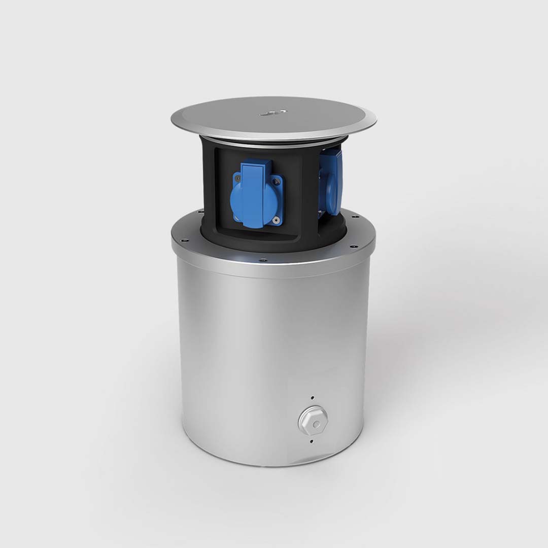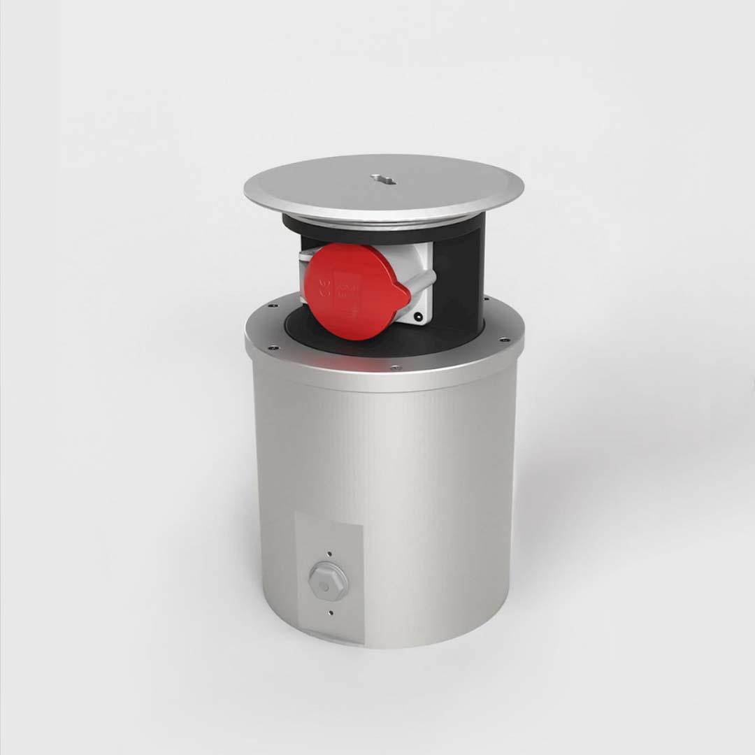 Senkverteiler/Senkelektrant SV301 für den Außenbereich, aus salzwasserbeständigem Aluminium. Der Senkverteiler SV301 ist mit einem PKW befahrbar. Die Standard-Oberfläche ist Alu-Natur. Hochziehen und Absenken der Geräte erfolgt mittels Sonderschlüssel. Bestückt ist der Senkverteiler standardmäßig mit 4 SCHUKO Steckdosen mit VDE Prüfzeichen. Das Gehäuse ist im geschlossenen Zustand wasserdicht, Schutzart IP 67. Weitere Bestückungsvarianten auf Anfrage.