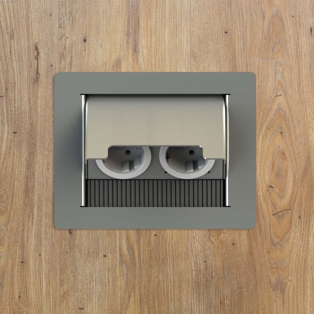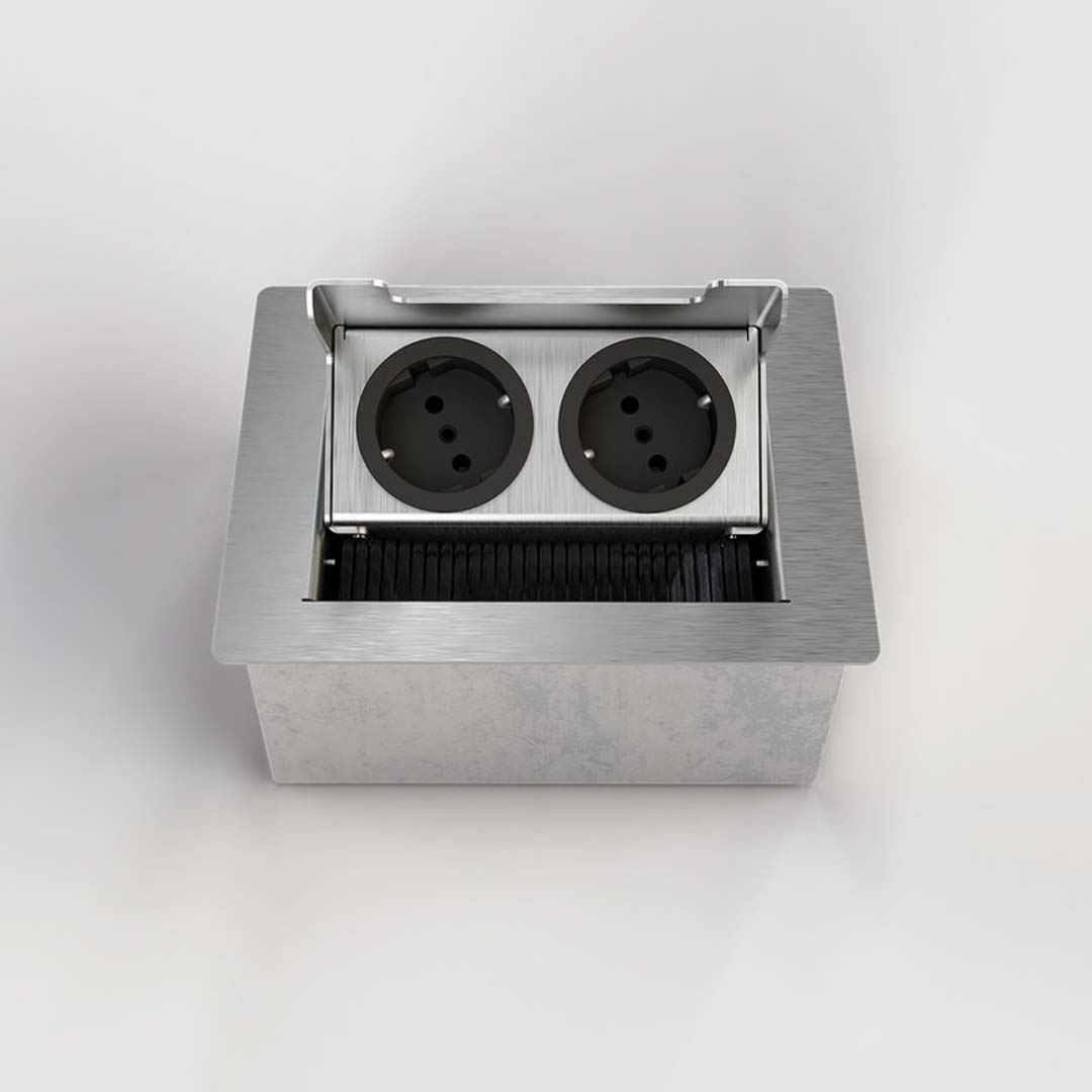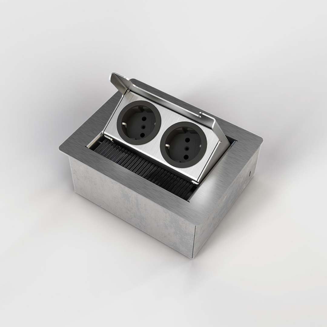 Tischsteckdose 3202E bestehend aus einem klappbaren Anschlussmodul aus 1,5 mm Edelstahl, geschliffen. Klappdeckel schließt auch bei gesteckten Steckern. Zur Montage ist der Geräteträger herausnehmbar. Mit einer Flächenlast von 120 kg ist die Tischsteckdose 3202E auch als Bodensteckdose einsetzbar. Besonders für Arbeitsflächen, Hohlböden, Messebereiche etc. geeignet. Weitere Bestückungsvarianten auf Anfrage. Einsatzbereich: In trocken- bis feuchtgepflegten Räumen