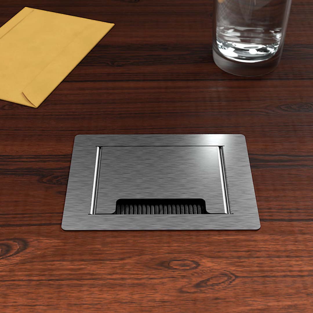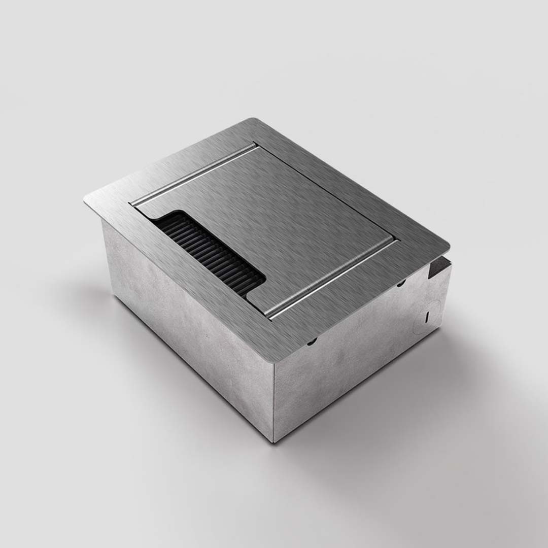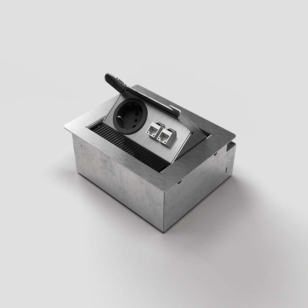Tischsteckdose 3202E bestehend aus einem klappbaren Anschlussmodul aus 1,5 mm Edelstahl, geschliffen. Klappdeckel schließt auch bei gesteckten Steckern. Zur Montage ist der Geräteträger herausnehmbar. Mit einer Flächenlast von 120 kg ist die Tischsteckdose 3202E auch als Bodensteckdose einsetzbar. Besonders für Arbeitsflächen, Hohlböden, Messebereiche etc. geeignet. Weitere Bestückungsvarianten auf Anfrage. Einsatzbereich: In trocken- bis feuchtgepflegten Räumen