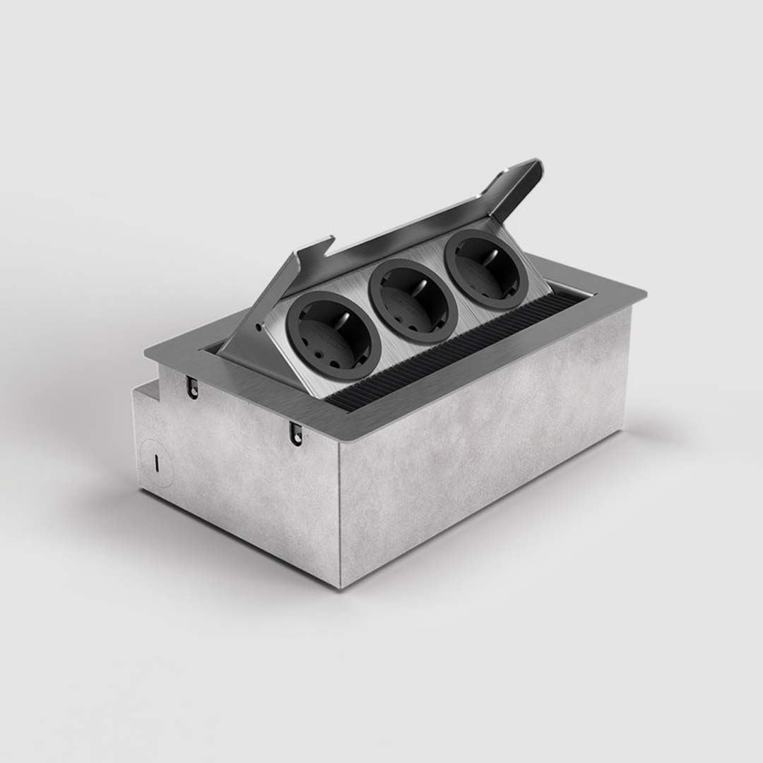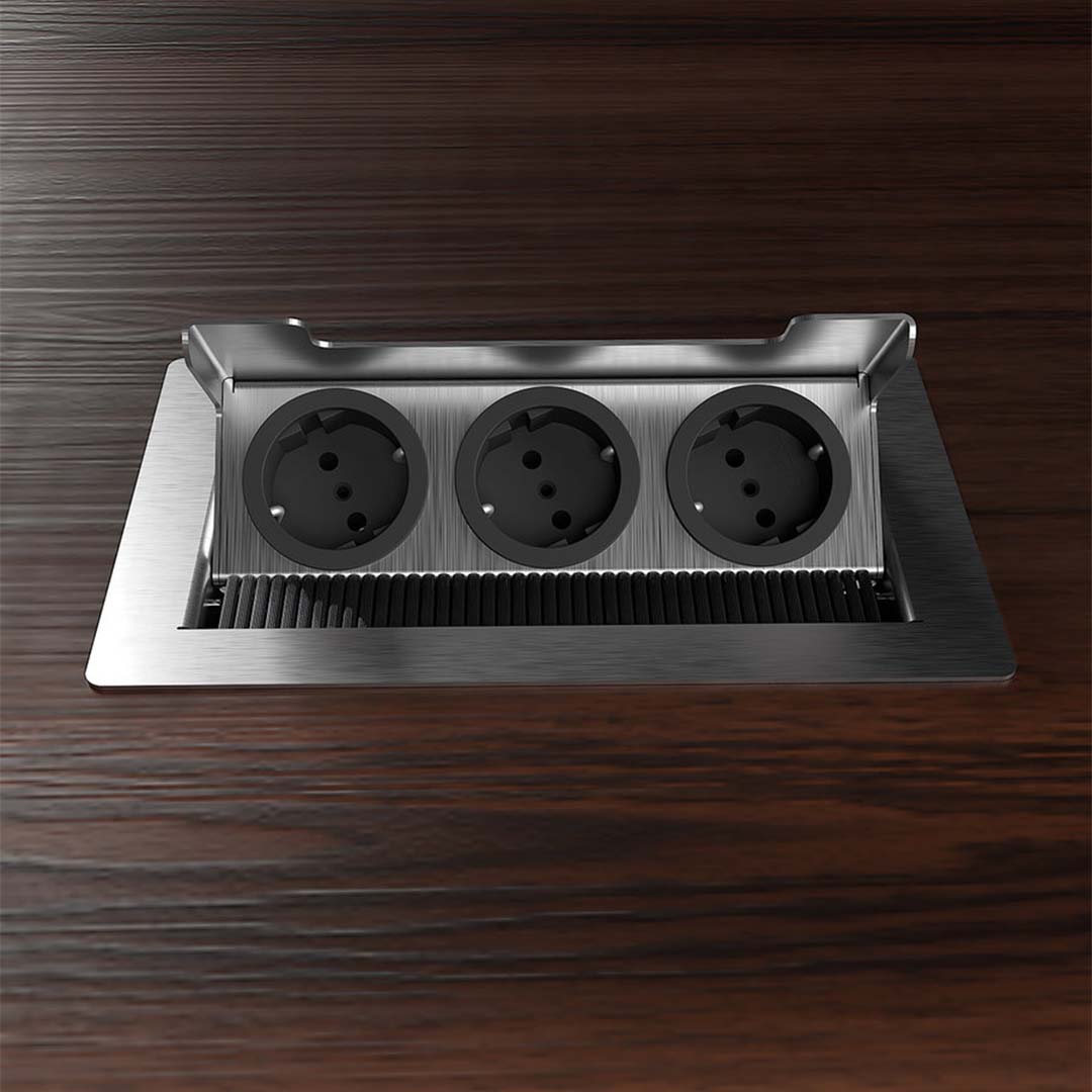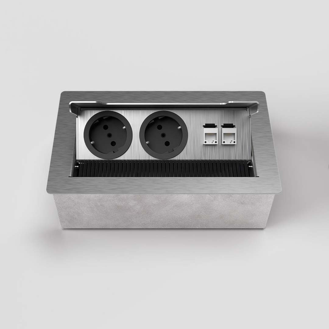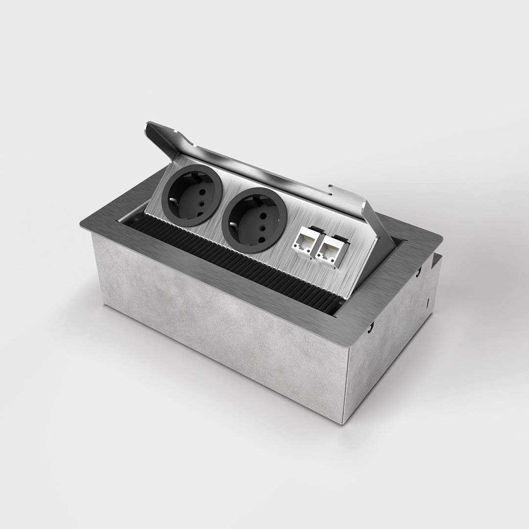 Tischsteckdose 3203E mit Anschlussmodul aus 1,5 mm Edelstahl, geschliffen, mit Klappdeckel. Der Klappdeckel schließt auch bei gesteckten Steckern. Zur Montage ist der Geräteträger herausnehmbar. Mit einer Flächenlast von 120 kg ist die Tischsteckdose 3203E auch als Bodensteckdose einsetzbar. Besonders für Arbeitsflächen, Hohlböden, Messebereiche etc. geeignet. Weitere Bestückungsvarianten auf Anfrage. Weitere Bestückungsvarianten auf Anfrage. Einsatzbereich: In trocken- bis feuchtgepflegten Räumen (Tischflächen / Hohlböden).